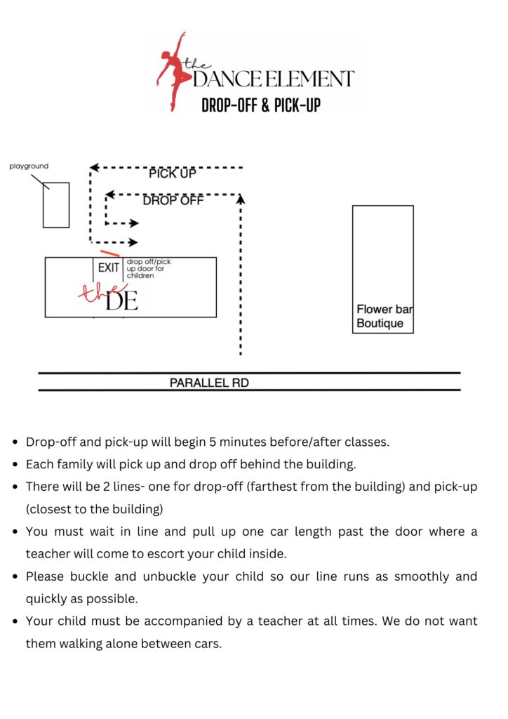 Staff begins drop-off 5 minutes before class and pick-up up to 5 minutes after.